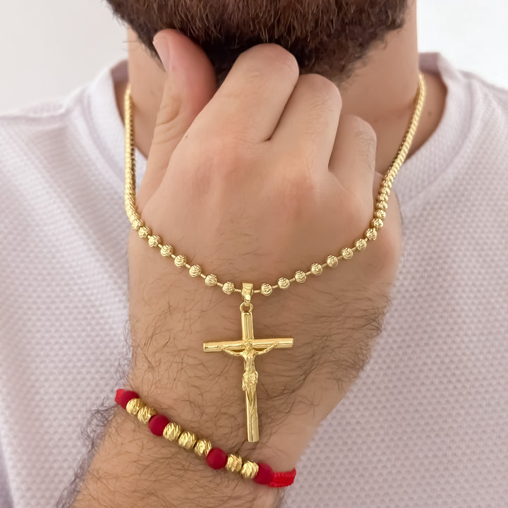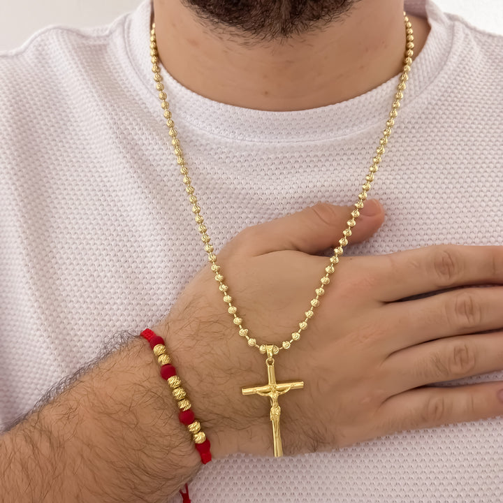 Cadena Tejido Militar Diamantada de 60cm de 4mm de Grosor + Cruz Cristo Madero Protección + Pulsera Hilo Rojo Balin Italiano de 5mm en Oro Laminado 18k con Garantia de por vida