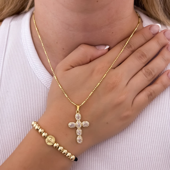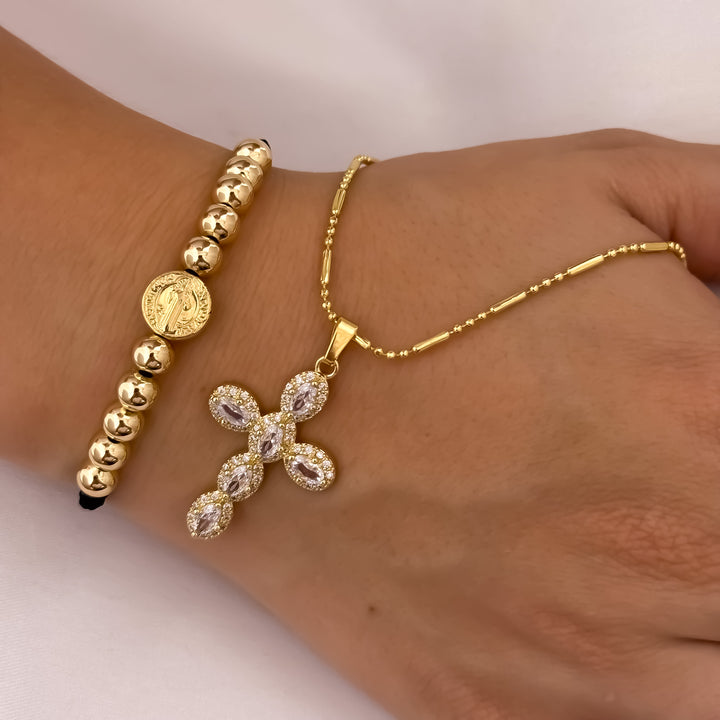 Cadena Tejido Militar Palillo + Cruz con Micro circones + Pulsera San Benito Balin de 6mm en Oro Laminado 18k con Garantia