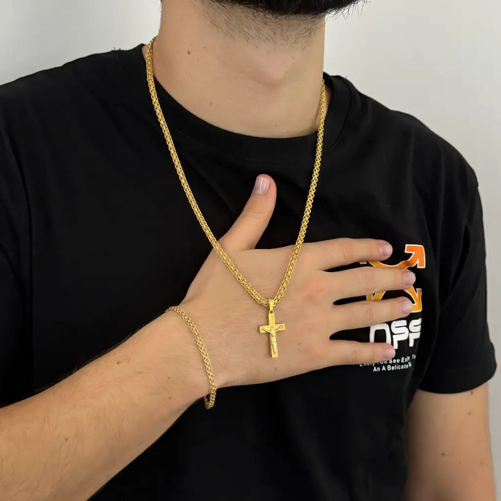 Conjunto De Caballero De Tejido Chino Con Cadena De 60cm-4mm De Grosor Con Dije De Crucifijo Pequeño + Pulsera De 20cm-3mm De Grosor + Envío Gratis