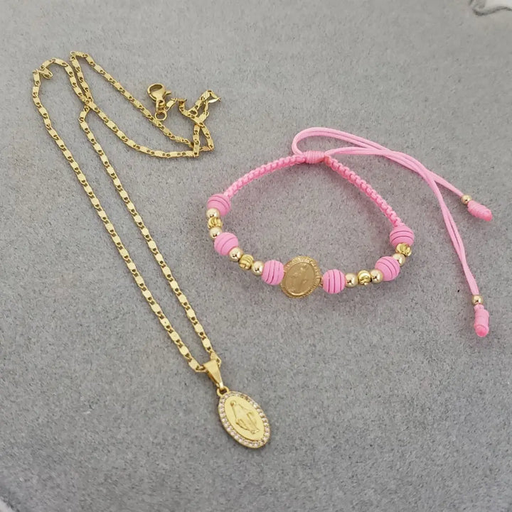 Conjunto De Niñas De La Virgen Milagrosa + Cadena De Tejido Caracol + Dije + Manilla Con Herraje. (Cadena De 40cm-1mm De Grosor)