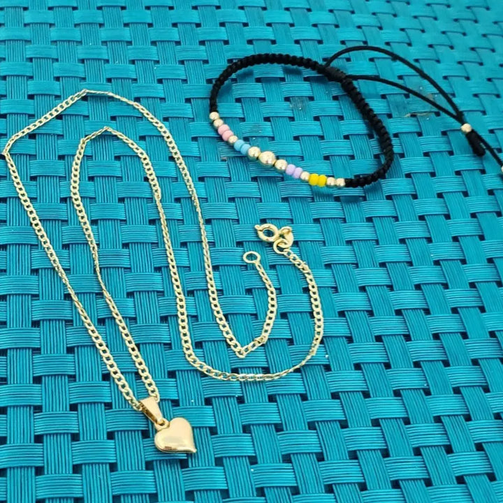 Conjunto De Niños De Cadena De Tejido Cubana + Dije De Corazón + Manilla. (Cadena De 40cm-2mm De Grosor)